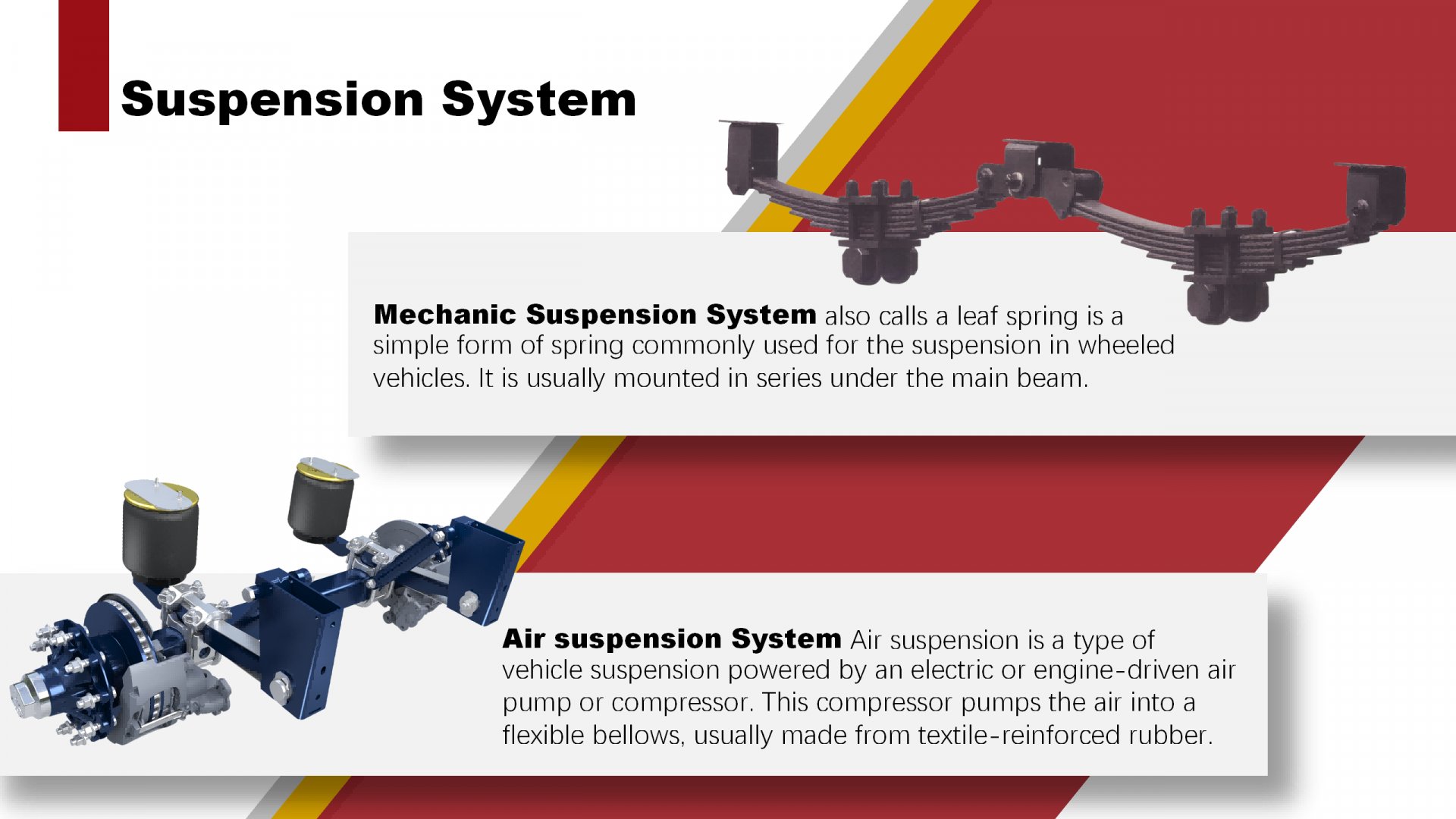 Mechanic Suspension System also calls a leaf spring is a simple form of spring commonly used for the suspension in wheeled vehicles. It is usually mounted in series under the main beam.